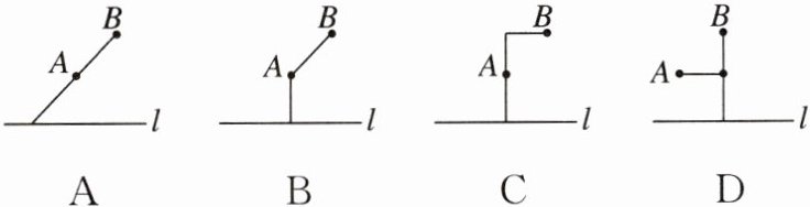 4. 如图,河道l的一侧有A,B两个村庄,现要铺设一条管道把河水引向A,B两村,下列四种方案中最节省材料的是 ( )