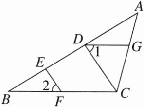 12. (16分)如图,点D,E在AB上,点F,G分别在BC,CA上,且DG//BC,∠1 = ∠2.