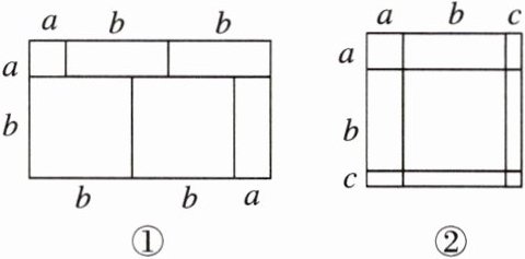 (1)如图②,将几个面积不等的小正方形与小长方形拼成一个边长为 $a + b + c$ 的正方形,试用不同的形式表示这个大正方形的面积,你能发现什么结论?请用等式表示出来.