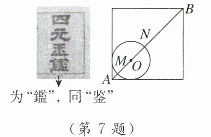 7. 新考向数学文化中国元代数学家朱世杰所著《四元玉鉴》记载有“锁套吞容”之“方田圆池结角池图”.“方田一段,一角圆池占之”意思是说:一块正方形田地,在其一角有一个圆形的水池(其中圆与正方形一角的两边均相切),如图所示.问题:此图中,正方形一条对角线AB与⊙O相交于点M,N(点N在点M的右上方).若AB的长度为10丈,⊙O的半径为2丈,则BN的长度为_______丈.