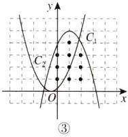 当抛物线C₁与C₂围成的封闭区域内在y轴上有整点(0,2),(0,3),(0,1)时,如图③。