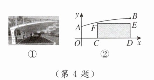 4. 情境题 实物抽象 如图①为一汽车停车棚,其棚顶的横截面可以看成是抛物线的一部分,如图②是棚顶的竖直高度y(单位:m)与距离停车棚支柱AO的水平距离x(单位:m)近似满足的函数关系$y = -0.02x^2 + 0.3x + 1.6$的图像,点B(6,2.68)在该图像上. 若一辆箱式货车需在停车棚下避雨,货车截面看成长CD = 4 m,高DE = 1.8 m的矩形,则可判定货车______完全停到车棚内(填“能”或“不能”).