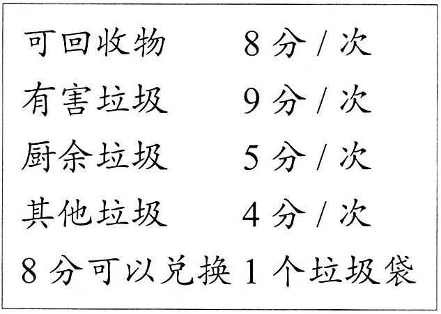 解析 投放一次其他垃圾可以获得4分,小杭投放了4次其他垃圾,求可以获得多少分,就是求4个4是多少,用乘法计算,即4×4 = 16(分)。8分可以兑换1个垃圾袋,求16分能兑换几个垃圾袋,就是求16里面有几个8,用除法计算,即16÷8 = 2(个)。@@(答案不唯一)正确投放几次有害垃圾可以获得27分?