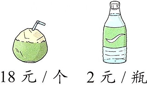 解析 根据题图可知,每个椰青18元,每瓶矿泉水2元,乐乐买了5瓶矿泉水,需要5×2 = 10(元),此时还剩50 - 5×2 = 40(元)。如果乐乐还要买1个椰青,求还剩多少元,用减法计算,列式是40 - 18 = 22(元)。