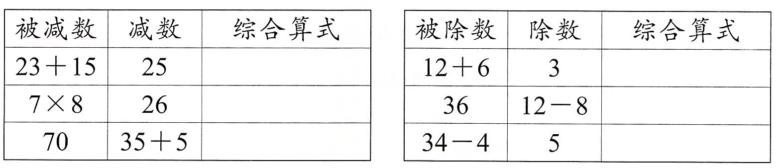 解析 第一个表格根据“被减数 - 减数 = 差”列出相应的算式。如:被减数是70,减数是35 + 5,即减数是“35 + 5”的和,用语言描述综合算式是“70减去35与5的和,差是多少”,因此需要借助小括号来先算“35 + 5”的和,写出相应的综合算式是70 - (35 + 5)。第二个表格根据“被除数÷除数 = 商”列出相应的算式。如:被除数是12 + 6,即被除数是“12 + 6”的和,除数是3,用语言描述综合算式是“12与6的和除以3,商是多少”,题目中有两级混合运算,且先算加法,再算除法,所以需要借助小括号来先算“12 + 6”的和,写出综合算式是(12 + 6)÷3 = 6。其他依次类推。
