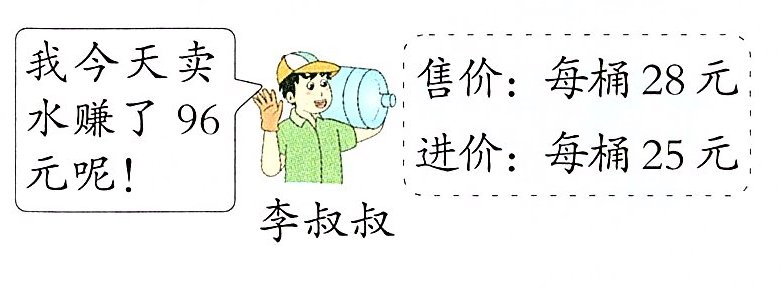 解析 每桶水进价25元,售价28元,说明每桶水可以赚3元。根据题图中所给信息,本题题意可以理解为“李叔叔卖水,每桶水可以赚3元,他今天卖水赚了96元。李叔叔今天一共卖了多少桶水?”就是求96里面有多少个3,用除法计算,列式为96÷3 = 32(桶)。