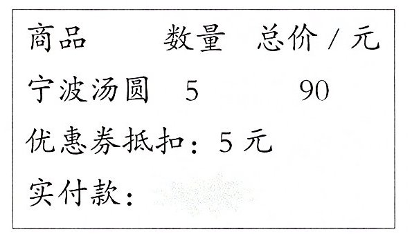 5. (新情境·地域美食)宁波汤圆是著名的特色小吃之一。孟叔叔买了5袋宁波汤圆。如图是购物小票,每袋宁波汤圆优惠后是多少元?