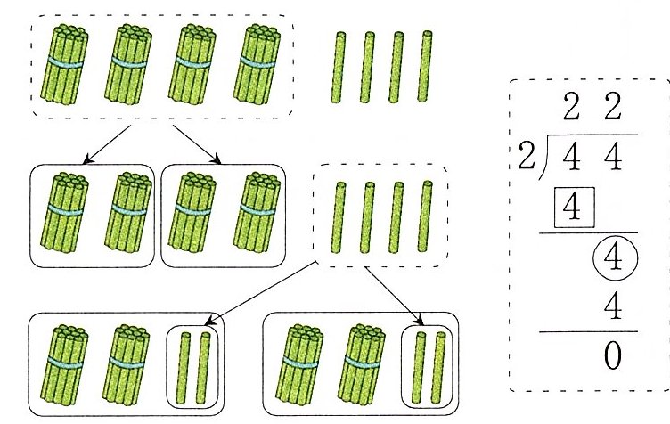 竖式中$\square$圈出的“4”,在分小棒的过程中表示的是( )。$\bigcirc$圈出的“4”,在分小棒的过程中表示的是( )。