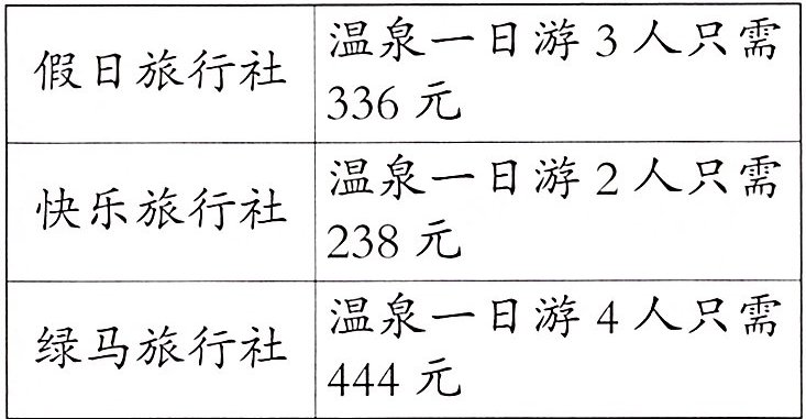 解析 分别求出每家旅行社人均价格是多少,然后比较,选人均价格最便宜的那家。假日旅行社人均价格为336÷3 = 112(元),快乐旅行社人均价格为238÷2 = 119(元),绿马旅行社人均价格为444÷4 = 111(元)。111<112<119,所以应选绿马旅行社。