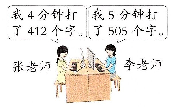 解析:张老师4分钟打了412个字,那么张老师平均每分钟打412÷4 = 103(个)字。李老师5分钟打了505个字,那么李老师平均每分钟打505÷5 = 101(个)字。张老师平均每分钟比李老师多打103 - 101 = 2(个)字。