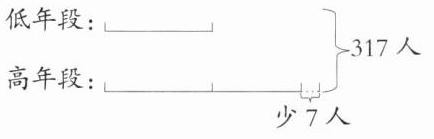 317 + 7 = 324(人) 2 + 1 = 3(份) 324÷3 = 108(人) 解析:观察线段图,高年段的人数再加7人,这时高年段的人数就是低年段人数的2倍,那么总人数就是317 + 7 = 324(人),这324人就相当于3份低年段的人数,因此低年段有324÷3 = 108(人)。
