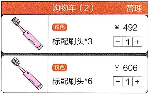 606 - 492 = 114(元) 6 - 3 = 3(个) 牙刷刷头:114÷3 = 38(元) 电动牙刷:492 - 38×3 = 378(元)解析 根据题意可知: 1支电动牙刷的价格 + 3个牙刷刷头的价格 = 492元 1支电动牙刷的价格 + 6个牙刷刷头的价格 = 606元 对比可知,题图中下面牙刷刷头比上面的牙刷刷头多6 - 3 = 3(个),多花了606 - 492 = 114(元),每个牙刷刷头的价格为114÷3 = 38(元)。根据“1支电动牙刷的价格 + 3个牙刷刷头的价格 = 492元”可知,1支电动牙刷的价格 = 492元 - 3个牙刷刷头的价格,列式为492 - 38×3 = 378(元)。