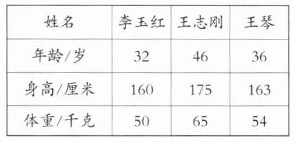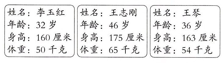 解析 首先确定表格各栏表示的内容,从题中知道一共有三位老师,老师的名字是不同的,按姓名分成横栏;统计时按年龄、身高、体重进行了统计,年龄、身高、体重分属三类,可以分成竖栏。表格各栏分好,在横栏从左到右依次填上姓名、李玉红、王志刚、王琴,在竖栏第二行从上到下依次填上年龄/岁、身高/厘米、体重/千克,然后把三位老师的个人信息数据填入表中即可。