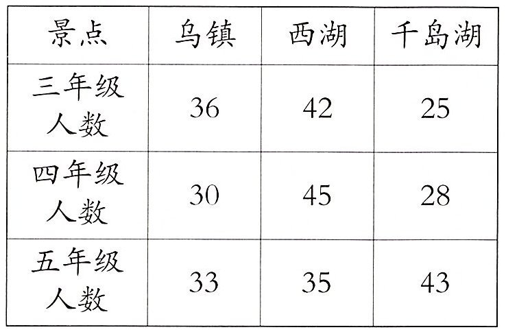 (2)三个年级的学生中参观乌镇的一共有( )人。