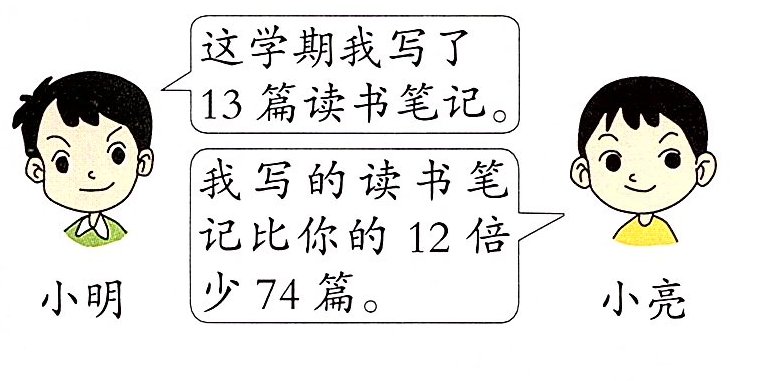 解析 先求出小亮写的读书笔记的篇数,再把两人写的读书笔记篇数相加。根据题意,小亮写的读书笔记有12×13 - 74 = 82(篇),两人一共写了82 + 13 = 95(篇)。