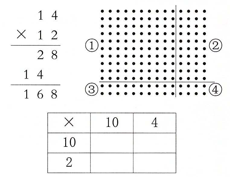 2. 学校迎国庆,后勤老师在门口摆花。每行 14 盆,摆了 12 行。结合竖式,将点子图中的序号填在表格中。