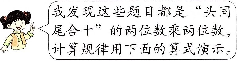 @@解析 两位数乘两位数中,如果两个数的十位数相同,个位数相加等于10,可以这样速算:两个数个位上的数相乘的结果作积的后半部分,十位上的数加1的和乘十位上的数的结果作积的前半部分,写在一起就是算式的积。@@3021@@2016@@4225@@3024@@5624@@4221
