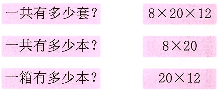实验小学购进 8 箱图书,每箱 20 套,每套有 12 本。