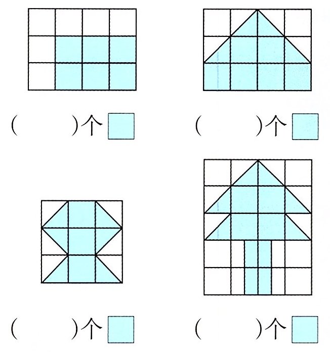 6@@8@@6@@9@@解析 数□时,先数出完整的□有多少个;不足1个的,看哪些拼在一起可以凑成□;然后把完整的□和凑成的□数量相加,就是一共有多少个□。