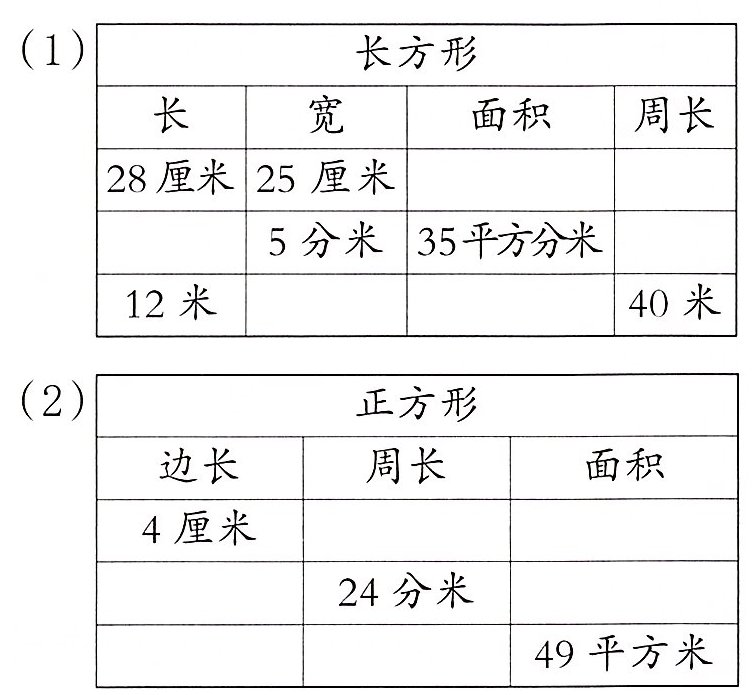 解析 根据“宽增加3米,面积就增加18平方米”可知,长方形的长为18÷3 = 6(米);根据“长增加4米,面积就增加16平方米”可知,长方形的宽为16÷4 = 4(米)。