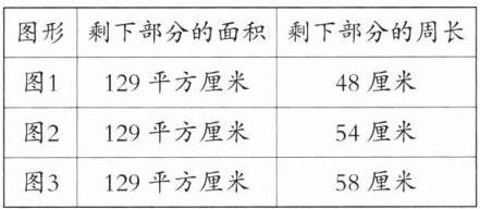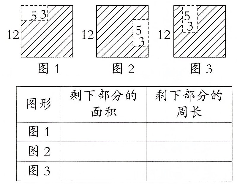 5. 在一张边长是 12 厘米的正方形纸中,剪去一个长 5 厘米、宽 3 厘米的长方形(有三种方法,如下图所示)。剩下部分的面积是多少?剩下部分的周长呢?