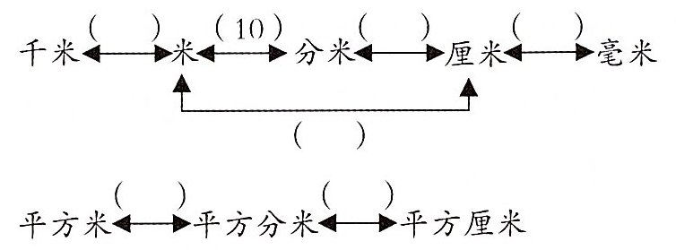 (1) 边长是 1 米的正方形,面积是( )平方米。也可以把它看作边长是( )分米的正方形,面积是( )平方分米,所以 1 平方米=( )平方分米。