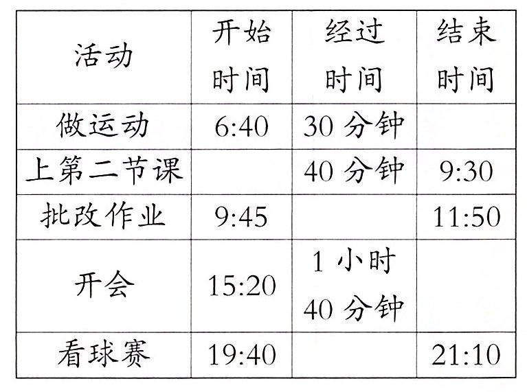 1. 某气象员观察记录空气污染情况,每天记录 5 次,第一次是早上 7:30,以后每隔 3 小时记录一次。请你用 24 时计时法标出每次记录的时间。