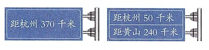 解析 根据路牌“距杭州370千米,距杭州50千米”可知,上午11时到下午3时,汽车一共行驶了370 - 50 = 320(千米)。下午3时是15时,15 - 11 = 4(时),也就是4小时行驶了320千米,红红乘坐的车平均每小时行驶320÷4 = 80(千米)。