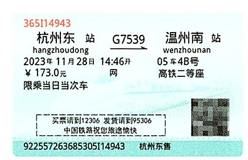 (2)王叔叔从杭州去温州,列车行驶完全程需要 3 小时 7 分钟,车票如图所示。王叔叔到达温州南站的时间是 2023 年 11 月 28 日( )。