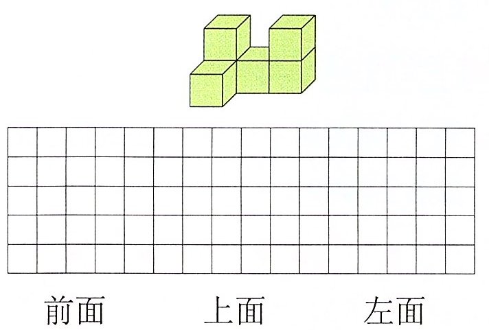 3. 下面是由 6 个小正方体搭成的立体图形,请分别把从前面、上面、左面看到的形状画在方格图上。