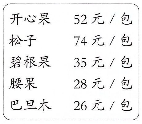 5. (新情境·生活应用)新年快到了,妈妈打算用 180 元买四包不同的坚果做一个坚果拼盘。以下是五种备选的坚果,妈妈怎样购买可以刚好用完预算?