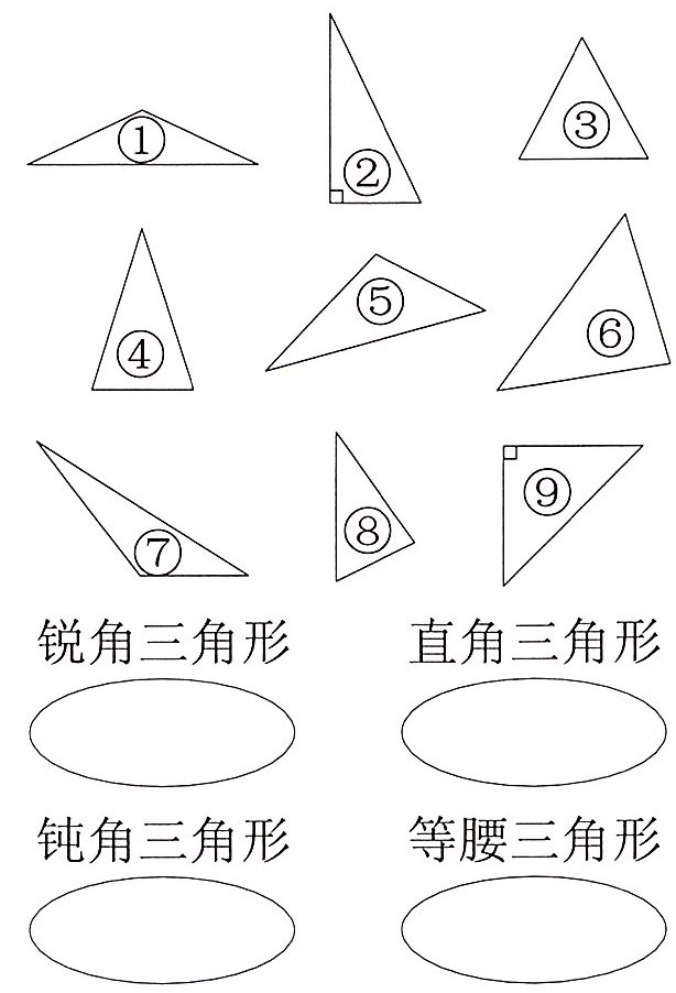 2. 给下面的三角形分类,把序号填在相应的圈内。