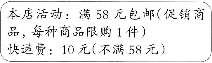 $23.88 + 7.6=31.48$(元)\n$31.48<58$ 不包邮。\n$31.48 + 10=41.48$(元)\n解析:先按照促销价算出这两件文具一共需要多少钱,再与58元作比较,发现不满58元,则要多付10元快递费。