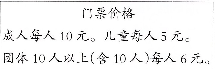解析 这道题中,老师和学生一起买票,可以有多种买票方案。方案一是将老师和学生分开买成人票和儿童票;方案二将老师和学生看成一个团体,全部买团体票;方案三,因为成人票价>团体票价>儿童票价,团体票只需要有10人就能买,所以让4名老师和6名学生买团体票,剩下的学生都买儿童票。分别计算出每种方案需要用的钱数,通过比较得出最合算的方案。