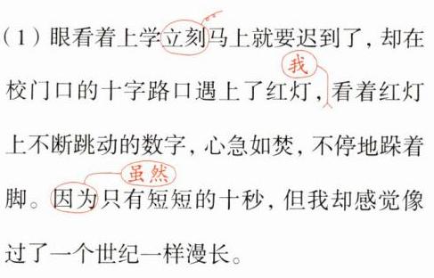 眼看着上学立刻马上就要迟到了,却在校门口的十字路口遇上了红灯,看着红灯上不断跳动的数字,心急如焚,不停地跺着脚。因为只有短短的十秒,但我却感觉像过了一个世纪一样漫长。