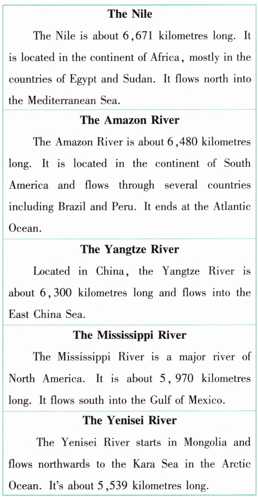 1 The Nile is about ________ kilometres longer than the Yangtze River.