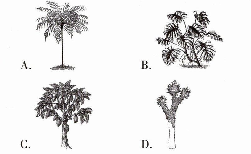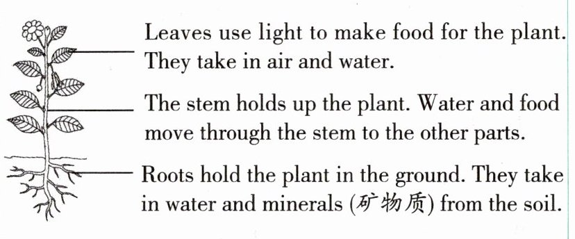 1. C 细节理解题。根据文中的"Leaves... take in air and water"及"Roots... take in water and minerals(矿物质) from the soil"可知答案。2. D 图文转换题。根据文中的"Desert plants: They have few or no leaves. These plants store water in thick stems"可知,只有 D 项具备沙漠植物的特征。3. C 信息还原题。根据设空后的"so the wind do not blow them down"可推知,所缺的词是 windy"多风的"。4. B 细节理解题。根据最后一段中的"The fruit keeps the seeds safe and helps them grow"可知答案。