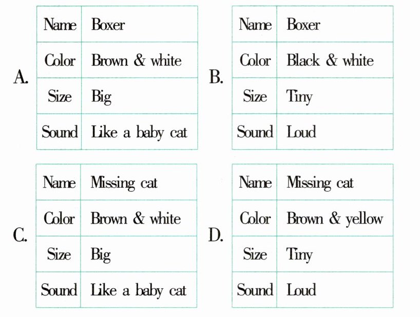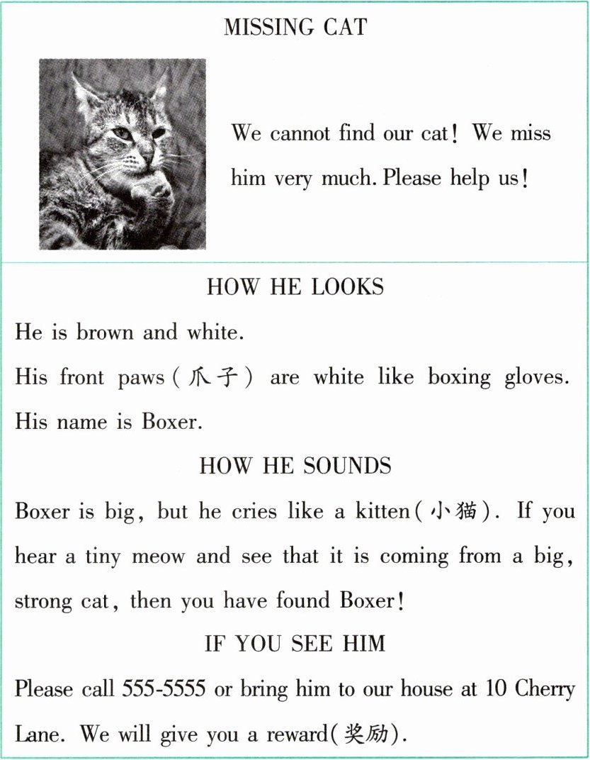1. D 写作意图题。根据表格中 MISSING CAT 部分的内容可知,这是一则寻找丢失的猫的启事。2. A 细节理解题。根据表格中 HOW HE LOOKS 和 HOW HE SOUNDS 两部分内容可知选 A。3. D 细节理解题。根据表格中 IF YOU SEE HIM 部分的内容可知,如果你发现了这只猫,可以打电话给猫的主人,也可以将其直接送到猫的主人家,故 D 项正确。