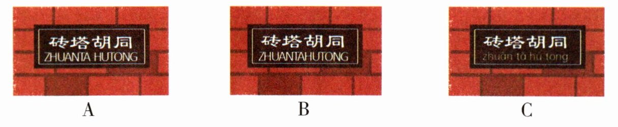 ⑨胡同是北京的特色,砖塔胡同是北京现存最古老的胡同之一,下列路牌中的拼音符合地名拼写规则的一项是( )。(北京)