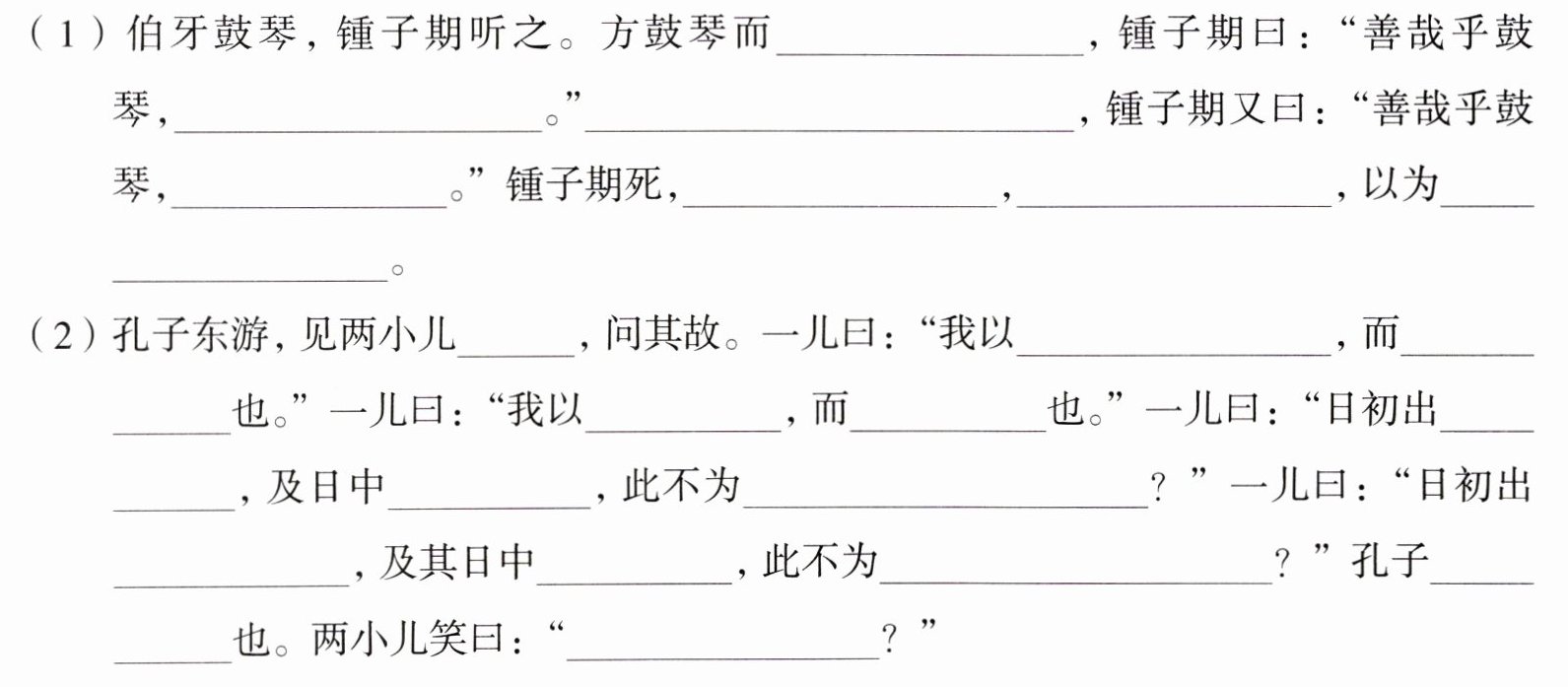 (1)志在太山 巍巍乎若太山 少选之间 而志在流水 汤汤乎若流水 伯牙破琴绝 弦 终身不复鼓琴 世无足复为鼓琴者 (2)辩斗 日始出时去人近 日中时远 日初出远 日中时近 大如车盖 则如盘 盂 远者小而近者大乎 沧沧凉凉 如探 汤 近者热而远者凉乎 不能决 孰为汝 多知乎
