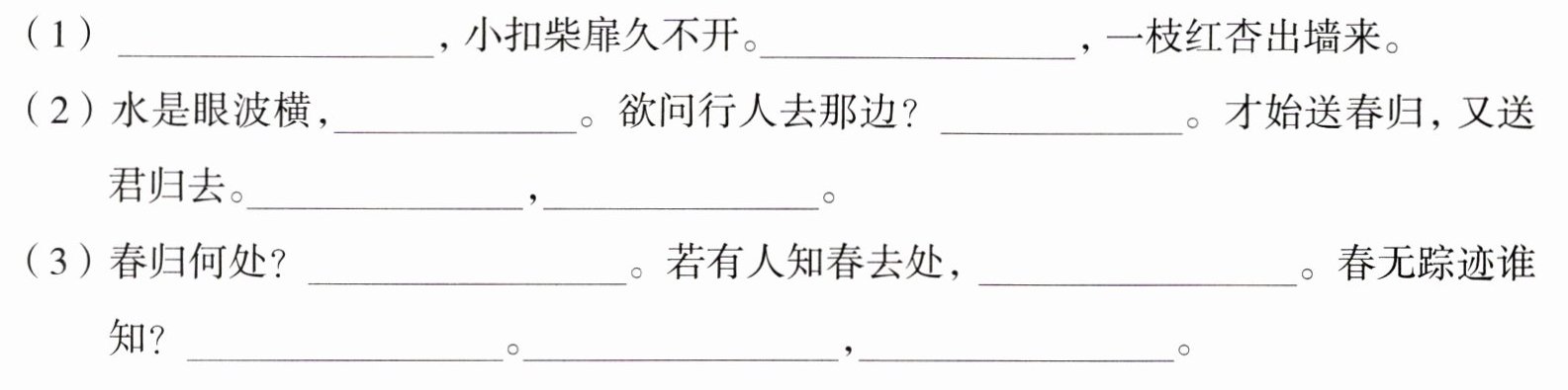 (1)应怜屐齿印苍苔 春色满园关不住 (2)山是眉峰聚 眉眼盈盈处 若到江南 赶上春 千万和春住 (3)寂寞无行路 唤取归来同住 除非问 取黄鹂 百啭无人能解 因风飞过蔷薇