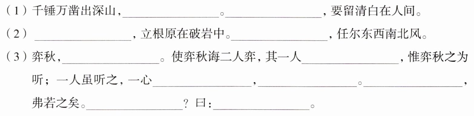 (1)烈火焚烧若等闲 粉骨碎身浑不怕 (2)咬定青山不放松 千磨万击还坚劲 (3)通国之善弈者也 专心致志 以为有 鸿鹄将至 思援弓缴而射之 虽与之俱学 为是其智弗若与 非然也