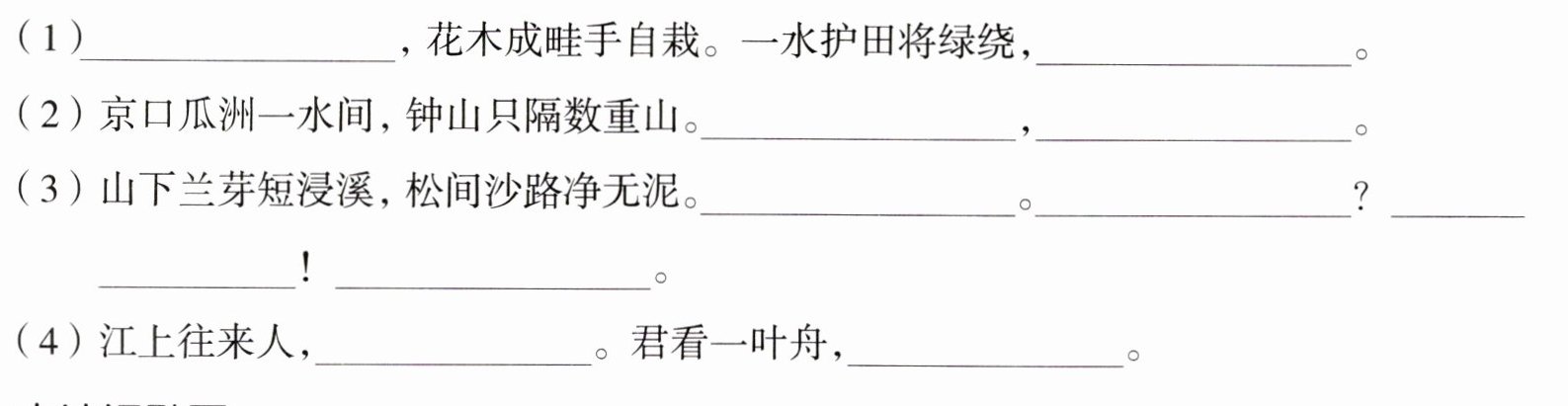 (1)茅檐长扫净无苔 两山排闼送青来 (2)春风又绿江南岸 明月何时照我还 (3)萧萧暮雨子规啼 谁道人生无再少 门前流水尚能西 休将白发唱黄鸡 (4)但爱鲈鱼美 出没风波里