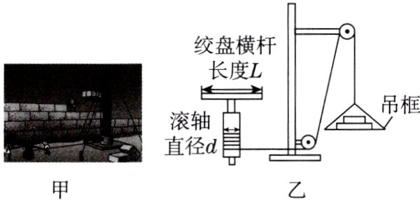 11. 古代科技 [2024·无锡三模]如图甲所示是我国古人使用绞车和滑轮吊起石材时的模拟图,其简化结构图如图乙所示。绞盘横杆长度L与滚轴直径d之比为4∶1。已知吊框的重力为100 N,不计绳重和机械间的所有摩擦,g取10 N/kg。