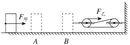 6.[多选]如图所示,甲工人用水平推力F甲推动重为750N的货物,在水平路面上匀速移动2m至仓库门口A处,用时10s,此过程中甲工人做功的功率P甲=30W;乙工人接着使用滑轮组拉动该货物在同样的路面上匀速移动3m到达指定位置B,拉力Fz为80N。则