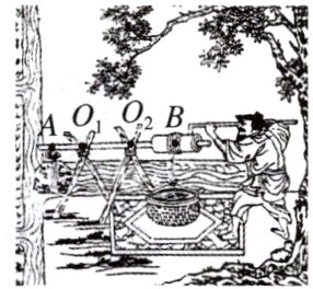 8. (古代典籍)[2024·无锡]如图是《天工开物》中记载的我国古代的提水工具“辘轳”,在两个支架上摆放一根直的硬棒,支点为O₁、O₂,A端系一石块,B端装有轮轴,轮轴能绕着硬棒转动,悬吊空桶的绳索另一端绕过轮轴后系紧在轮轴上。若空桶质量为10kg,轮轴质量为10kg,空桶和轮轴对硬棒的作用力视作施加在B位置,O₁A长为0.6m,O₁O₂长为1m,O₂B长为0.8m,硬棒及绳索质量忽略不计。(g取10N/kg)