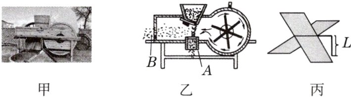 3. (古代科技)端午假日,小华随父母体验了一次快乐的乡村游,见到如图甲所示的一个老式风扇车。查资料知,我国西汉时已有风扇车,它由车架、风扇(含摇杆)、喂料斗及出粮口等构成,主要用于清除谷物颗粒中的杂物及空瘪谷。