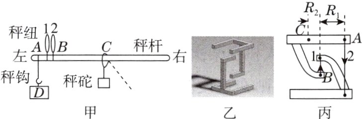 (2)小亮认为如图乙所示的网红张拉整体结构和杆秤一样,也是一种杠杆,于是将其模型化(如图丙所示),C点为上半部分重心,2根下拉上半部分的轻绳简化成一根(2号线),A、B水平距离R₁为0.2m,B、C水平距离R₂为0.1m,上半部分质量为0.2kg。(g取10N/kg)