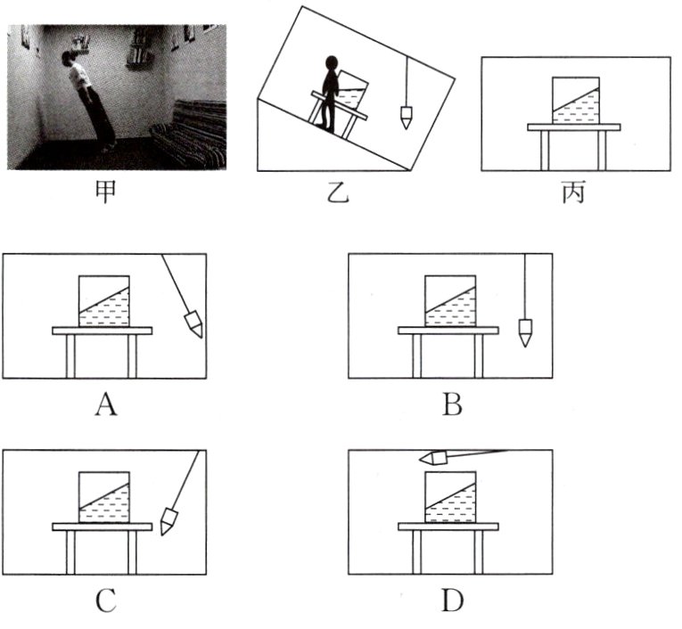 6.(科学推理)[2024·青岛期末]“倾斜小屋”在娱乐场所十分流行。如图甲,人在“倾斜小屋”内要“倾斜”才能站稳,它的原理如图乙,把小屋倾斜建设,以给屋内视角的人造成“倾斜站立”的错觉。在屋内桌面放一桶水,静止时,屋内视角如图丙所示。若在屋顶用软绳悬挂一个重锤,则重锤静止时,它的位置应为选项中的 ( )