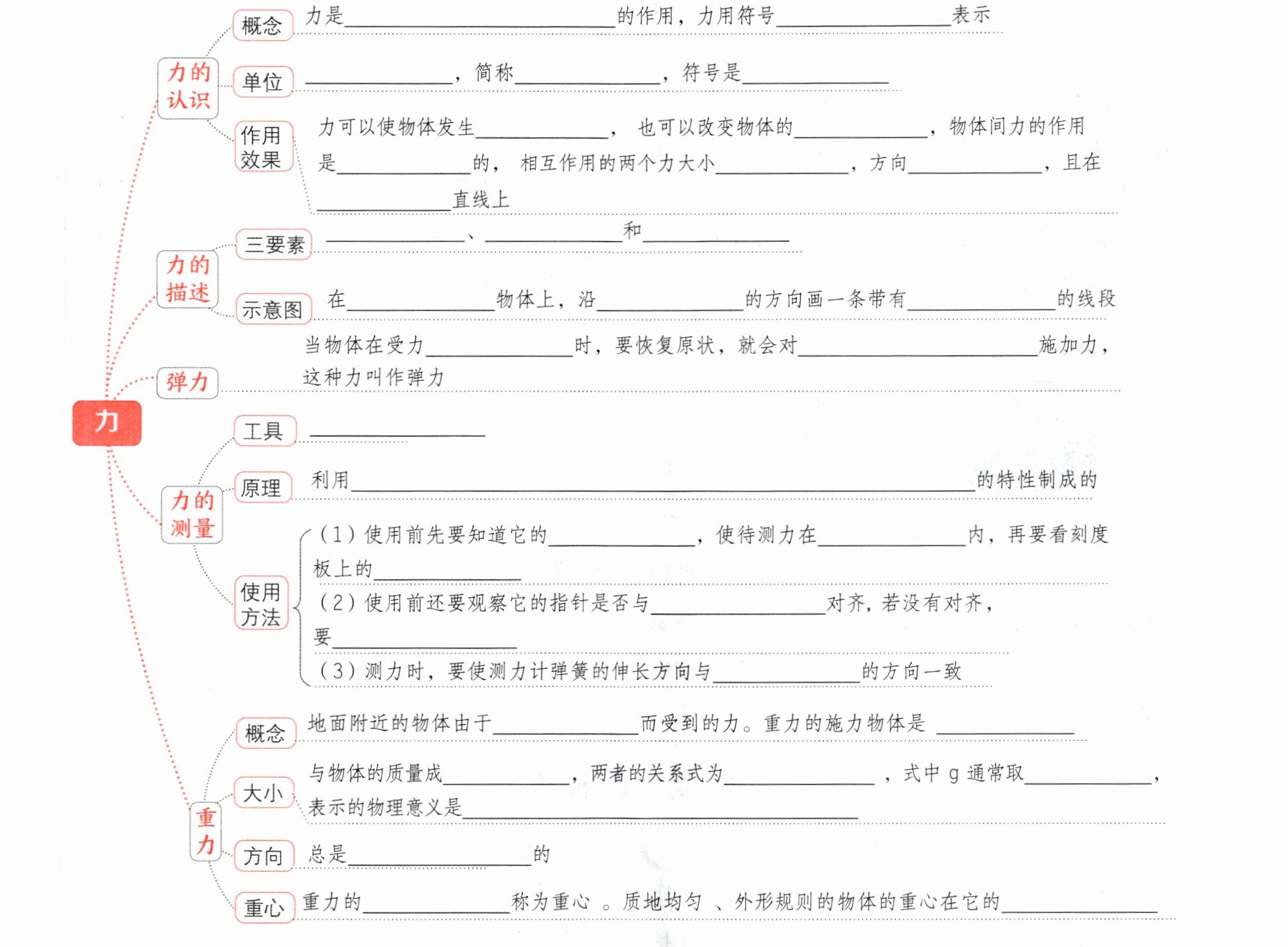 反; 同一条;大小; 方向;作用点;受力; 力:箭头;发生形变;跟
